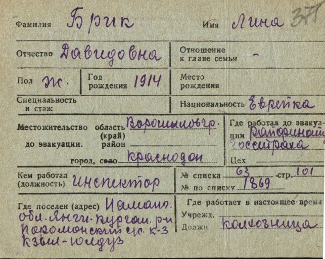 Lina Brik was born, 1914 to David. Prior to WWII she lived in Krasnodon, Ukraine (USSR). During the war she was in Uzbekistan (USSR). Lina was registered following the evacuation/ in the interior of the Soviet Union.