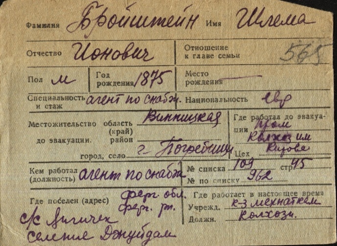 Shlema Broyshteyn was born, 1875 to Ion. Prior to WWII he lived in Pogrebishche, Ukraine (USSR). During the war he was in Uzbekistan (USSR). Shlema was registered following the evacuation/ in the interior of the Soviet Union.