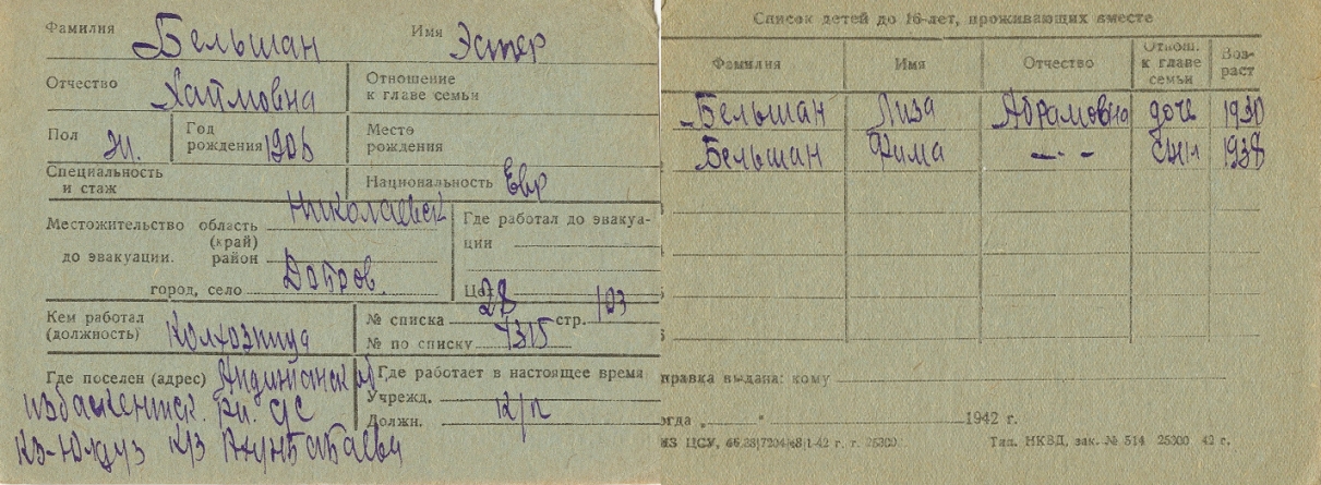 Ester Belshan was born, 1906 to Khaim. Prior to WWII she lived in Dobraya, Ukraine (USSR). During the war she was in Uzbekistan (USSR). Ester was registered following the evacuation/ in the interior of the Soviet Union.