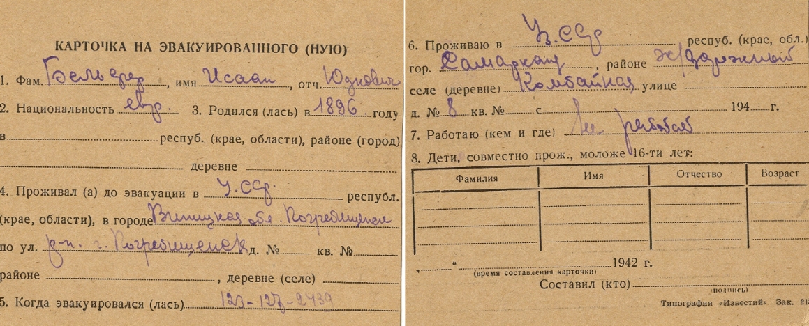 Isaak Belfer was born, 1896 to Yudka. Prior to WWII he lived in Pogrebishche, Ukraine (USSR). During the war he was in Uzbekistan (USSR). Isaak was registered following the evacuation/ in the interior of the Soviet Union.
