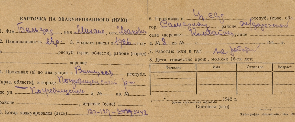 Mikhail Belfer was born, 1926 to Isaak. He was child. Prior to WWII he lived in Pogrebishche, Ukraine (USSR). During the war he was in Uzbekistan (USSR). Mikhail was registered following the evacuation/ in the interior of the Soviet Union.