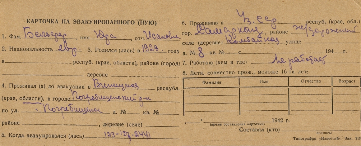 Yuda Belfer was born, 1923 to Isak. Prior to WWII he lived in Pogrebishche, Ukraine (USSR). During the war he was in Uzbekistan (USSR). Yuda was registered following the evacuation/ in the interior of the Soviet Union.
