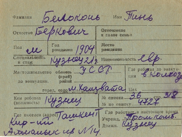 Pin Belokon was born, 1904 to Berko. Prior to WWII he lived in Khashchevatoye, Ukraine (USSR). During the war he was in Uzbekistan (USSR). Pin was registered following the evacuation/ in the interior of the Soviet Union.