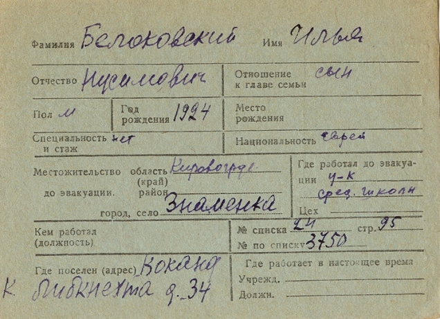 Iliya Belokovskiy was born, 1924 to Nusim. Prior to WWII he lived in Znamenka, Ukraine (USSR). During the war he was in Uzbekistan (USSR). Iliya was registered following the evacuation/ in the interior of the Soviet Union.