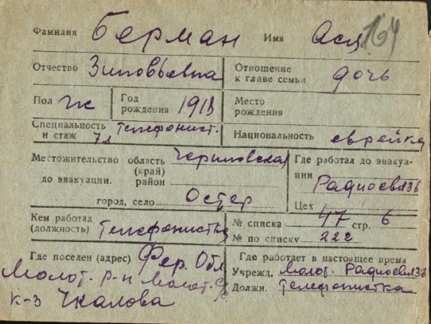 Asya Berman was born, 1918 to Zinoviy. Prior to WWII she lived in Oster, Ukraine (USSR). During the war she was in Uzbekistan (USSR). Asya was registered following the evacuation/ in the interior of the Soviet Union.