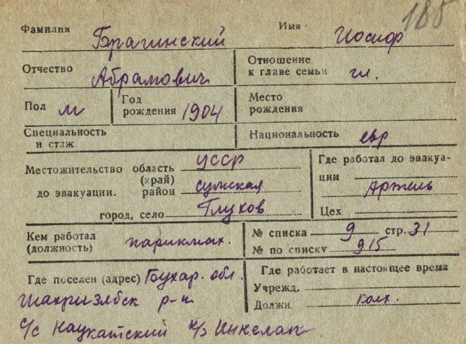 Iosif Braginskiy was born, 1904 to Abram. Prior to WWII he lived in Glukhov, Ukraine (USSR). During the war he was in Uzbekistan (USSR). Iosif was registered following the evacuation/ in the interior of the Soviet Union.