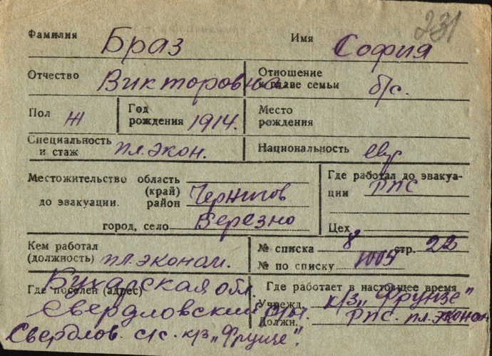 Sofiya was registered following the evacuation/ in the interior of the Soviet Union.