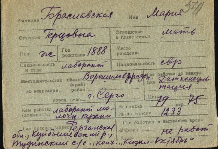 Mariya Braslavskaya was born, 1888 to Gertz. Prior to WWII she lived in Sergo, Ukraine (USSR). During the war she was in Uzbekistan (USSR). Mariya was registered following the evacuation/ in the interior of the Soviet Union.