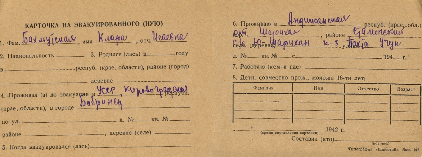Klara Bakhmutskaya was born to Isay. Prior to WWII she lived in Bobrinets, Ukraine (USSR). During the war she was in Uzbekistan (USSR). Klara was registered following the evacuation/ in the interior of the Soviet Union.