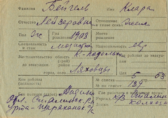 Klara Beygel was born, 1908 to Leyzer. Prior to WWII she lived in Lyakhovtsy, Ukraine (USSR). During the war she was in Uzbekistan (USSR). Klara was registered following the evacuation/ in the interior of the Soviet Union.