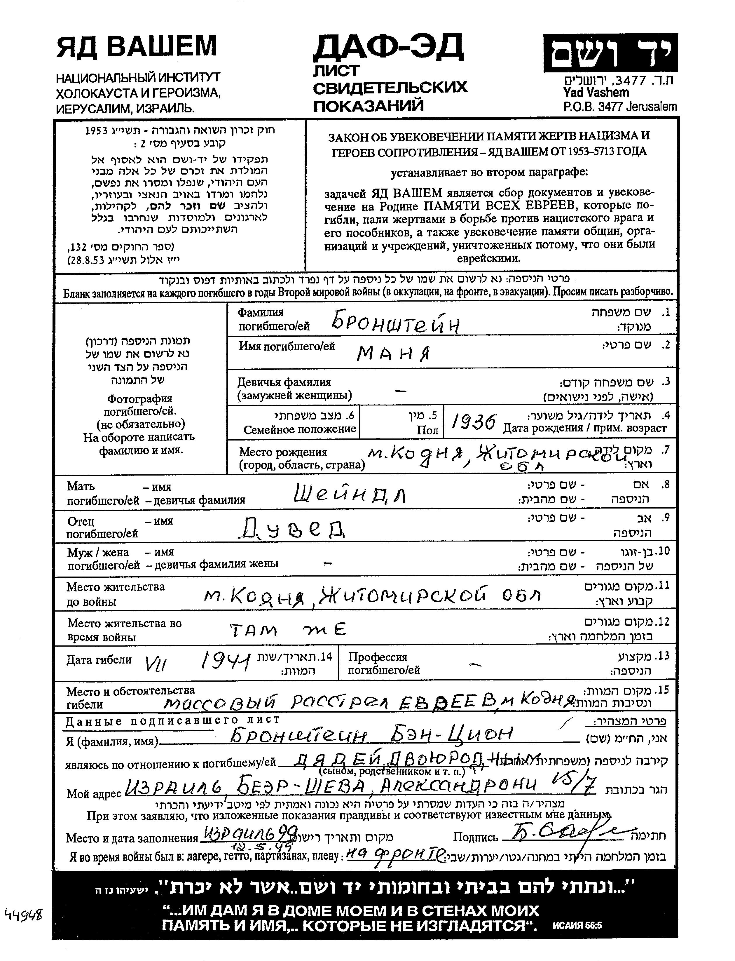 Manya Bronshtein was born in Kodnya, Ukraine (USSR), 1936 to Duved and Sheindl. She was child. Prior to WWII she lived in Kodnya, Ukraine (USSR). During the war she was in Kodnya, Ukraine (USSR). Manya was murdered in the Shoah. Place of death: Kodnya, Ukraine (USSR), 07/1941.