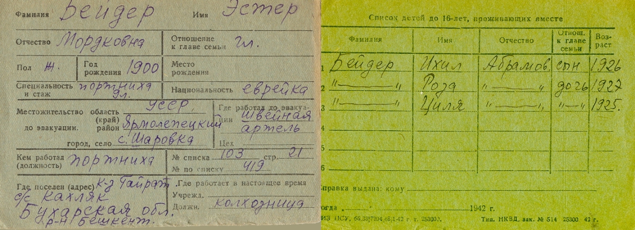 Ester was registered following the evacuation/ in the interior of the Soviet Union.