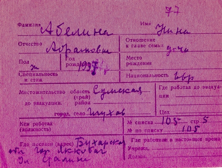 Nina Abelina was born, 1937 to Abram. She was child. Prior to WWII she lived in Glukhov, Ukraine (USSR). During the war she was in Uzbekistan (USSR). Nina was registered following the evacuation/ in the interior of the Soviet Union.