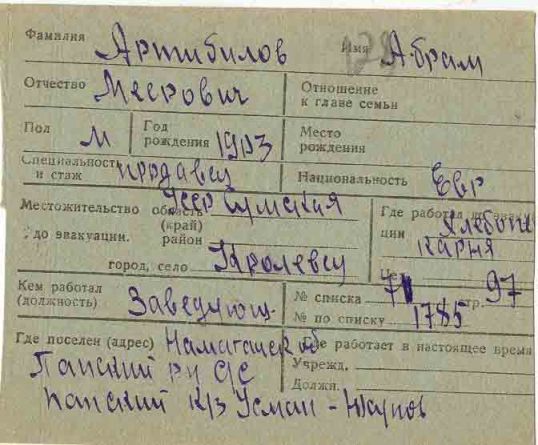 Abram Artibilov was born, 1903 to Meyer. Prior to WWII he lived in Krolevets, Ukraine (USSR). During the war he was in Uzbekistan (USSR). Abram was registered following the evacuation/ in the interior of the Soviet Union.