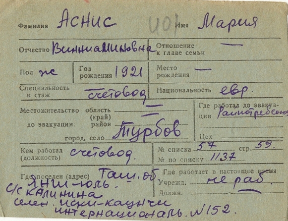 Mariya Asnis was born, 1921 to Vinniamin. Prior to WWII she lived in Turbov, Ukraine (USSR). During the war she was in Uzbekistan (USSR). Mariya was registered following the evacuation/ in the interior of the Soviet Union.