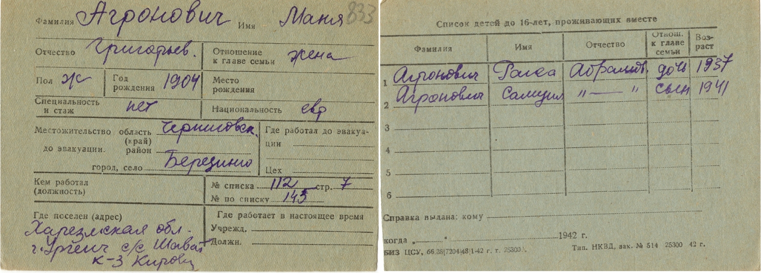 Agranovich Manya 1904 Berezna, Ukraine (USSR) List of evacuated persons