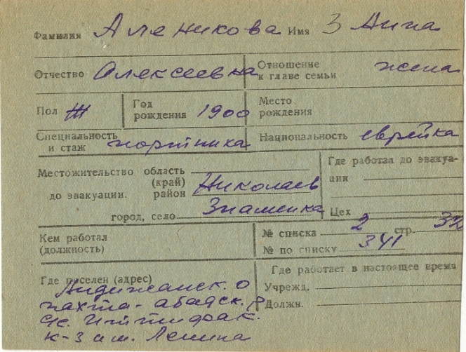 Anna Alenikova was born, 1900 to Aleksey. Prior to WWII she lived in Znamenka, Ukraine (USSR). During the war she was in Uzbekistan (USSR). Anna was registered following the evacuation/ in the interior of the Soviet Union.