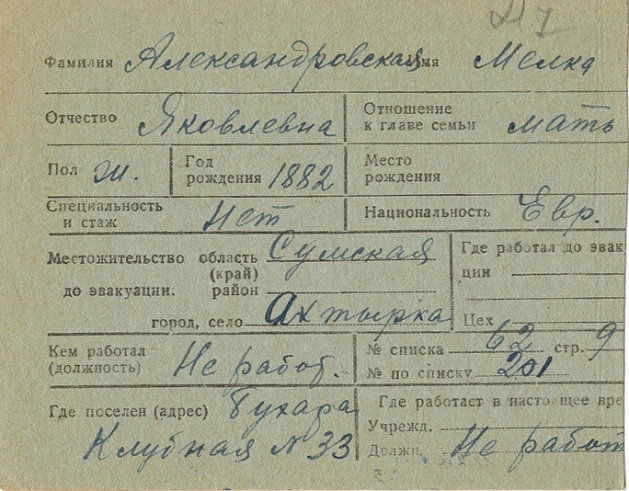 Melka Aleksandrovskaya was born, 1882 to Yakov. Prior to WWII she lived in Akhtyrka, Ukraine (USSR). During the war she was in Uzbekistan (USSR). Melka was registered following the evacuation/ in the interior of the Soviet Union.