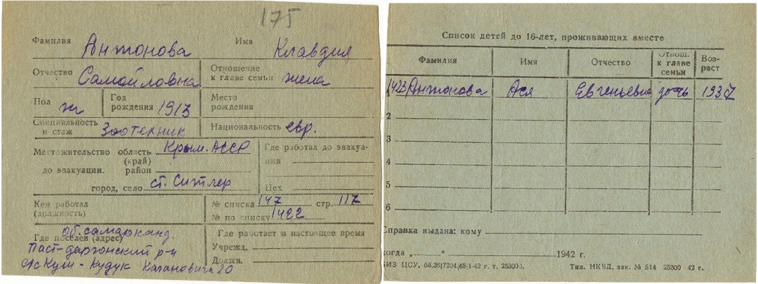 Klavdiya was registered following the evacuation/ in the interior of the Soviet Union.