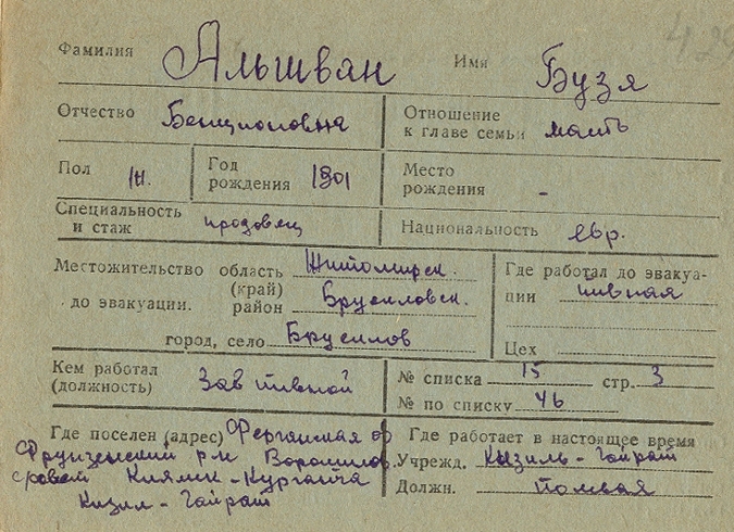 Buzya Alshvan was born, 1901 to Bentzion. Prior to WWII she lived in Brusilov, Ukraine (USSR). During the war she was in Uzbekistan (USSR). Buzya was registered following the evacuation/ in the interior of the Soviet Union.
