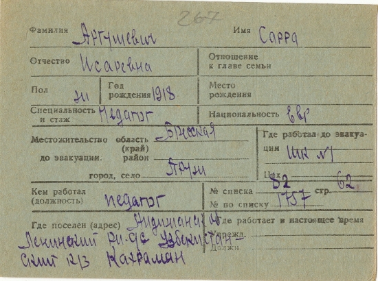 Sarra Argushevich was born, 1918 to Isar. Prior to WWII she lived in Pruzhany, Poland. During the war she was in Uzbekistan (USSR). Sarra was registered following the evacuation/ in the interior of the Soviet Union.