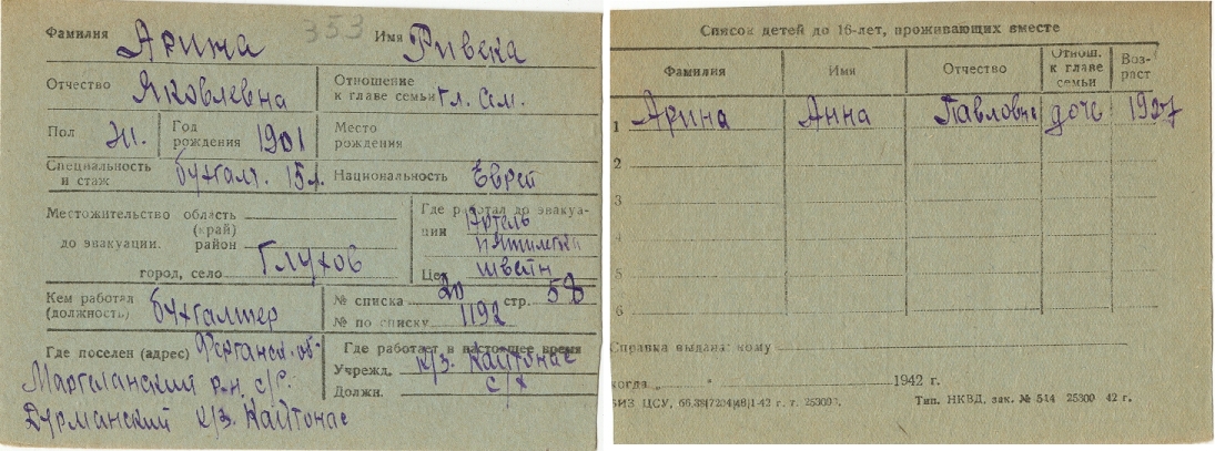 Riveka Arina was born, 1901 to Yakov. Prior to WWII she lived in Glukhov, Ukraine (USSR). During the war she was in Uzbekistan (USSR). Riveka was registered following the evacuation/ in the interior of the Soviet Union.
