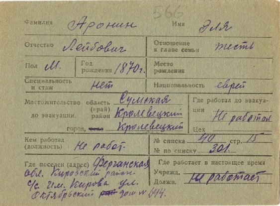 Elya Aronin was born, 1870 to Leyb. Prior to WWII he lived in Krolevets, Ukraine (USSR). During the war he was in Uzbekistan (USSR). Elya was registered following the evacuation/ in the interior of the Soviet Union.