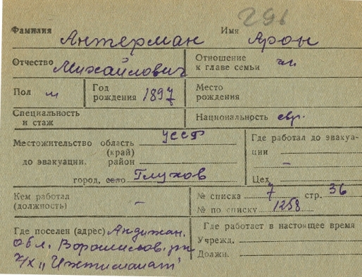 Aron Anterman was born, 1897 to Mikhail. Prior to WWII he lived in Glukhov, Ukraine (USSR). During the war he was in Uzbekistan (USSR). Aron was registered following the evacuation/ in the interior of the Soviet Union.