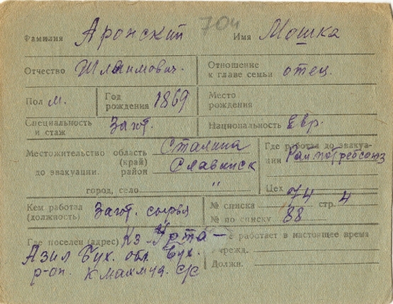 Moshka Aronskiy was born, 1869 to Shlaimo. Prior to WWII he lived in Slavyansk, Ukraine (USSR). During the war he was in Uzbekistan (USSR). Moshka was registered following the evacuation/ in the interior of the Soviet Union.