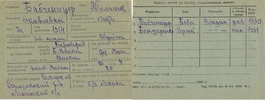 Pelageya Babchenitzer was born, 1914 to Yakov. Prior to WWII she lived in Bolshaya Viska, Ukraine (USSR). During the war she was in Uzbekistan (USSR). Pelageya was registered following the evacuation/ in the interior of the Soviet Union.