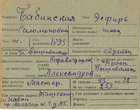 Esfir Babinskaya was born, 1893 to Solomon. Prior to WWII she lived in Aleksandriya, Ukraine (USSR). During the war she was in Uzbekistan (USSR). Esfir was registered following the evacuation/ in the interior of the Soviet Union.