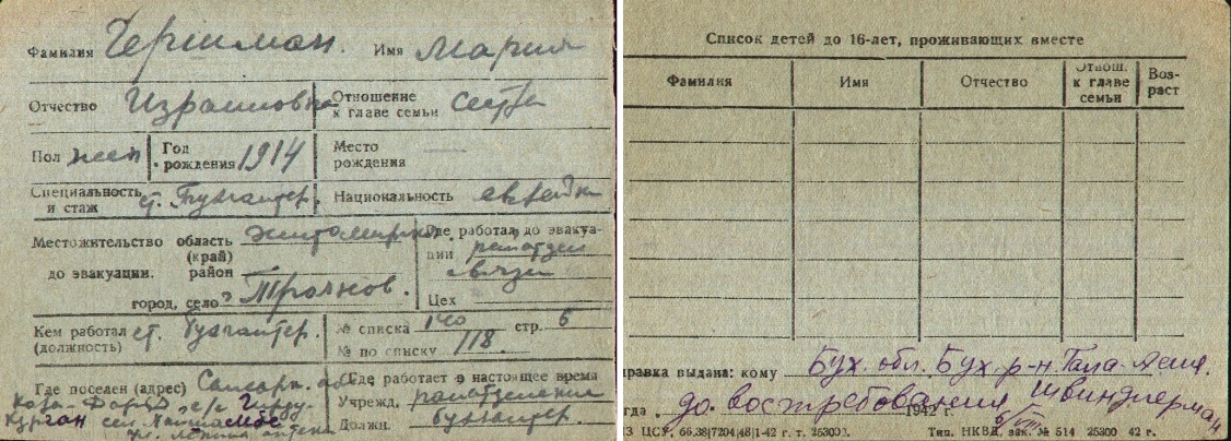 Mariya Gershman was born, 1914 to Izrail. Prior to WWII she lived in Troyanov, Ukraine (USSR). During the war she was in Uzbekistan (USSR). Mariya was registered following the evacuation/ in the interior of the Soviet Union.