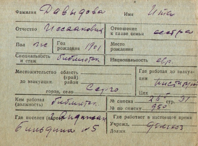 Ita Davydova was born, 1901 to Isaak. Prior to WWII she lived in Sergo, Ukraine (USSR). During the war she was in Uzbekistan (USSR). Ita was registered following the evacuation/ in the interior of the Soviet Union.