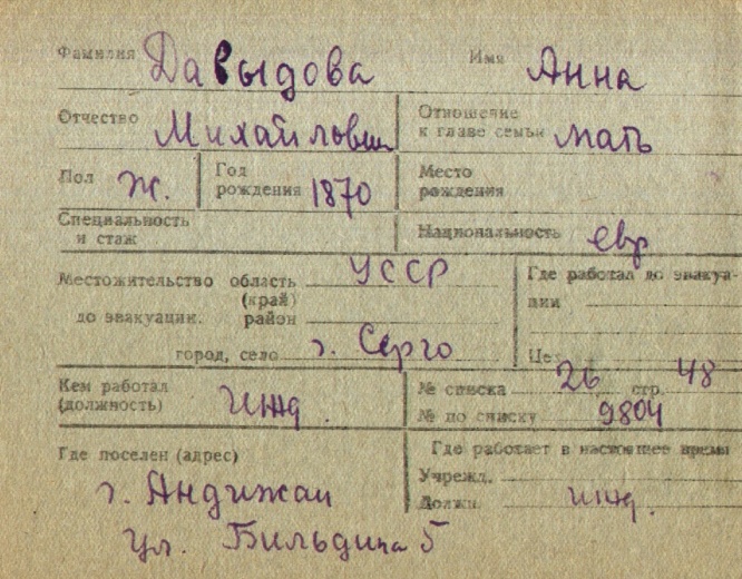 Anna Davydova was born, 1870 to Mikhail. Prior to WWII she lived in Sergo, Ukraine (USSR). During the war she was in Uzbekistan (USSR). Anna was registered following the evacuation/ in the interior of the Soviet Union.