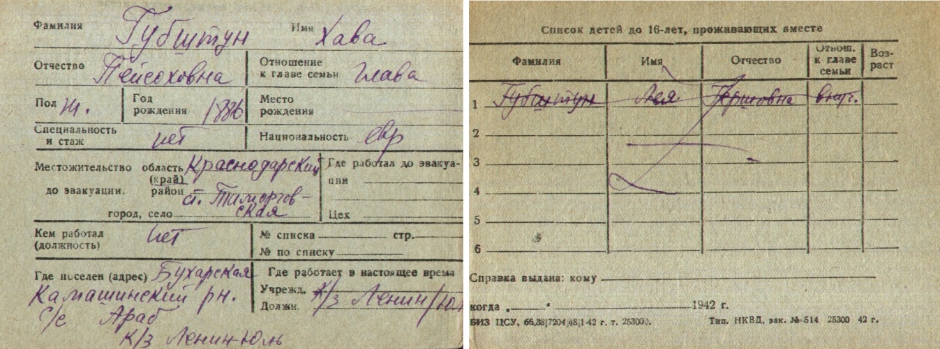 Khava Gubshtun was born, 1886 to Peysokh. Prior to WWII she lived in Temirgoyevskaya, Russia (USSR). During the war she was in Uzbekistan (USSR). Khava was registered following the evacuation/ in the interior of the Soviet Union.