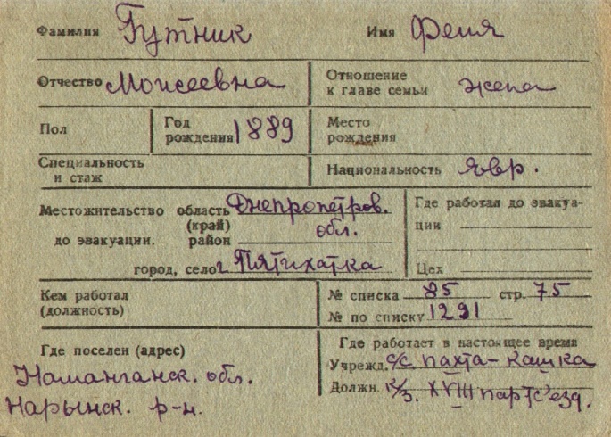 Fenya Gutnik was born, 1889 to Moisey. Prior to WWII she lived in Pyatikhatki, Ukraine (USSR). During the war she was in Uzbekistan (USSR). Fenya was registered following the evacuation/ in the interior of the Soviet Union.