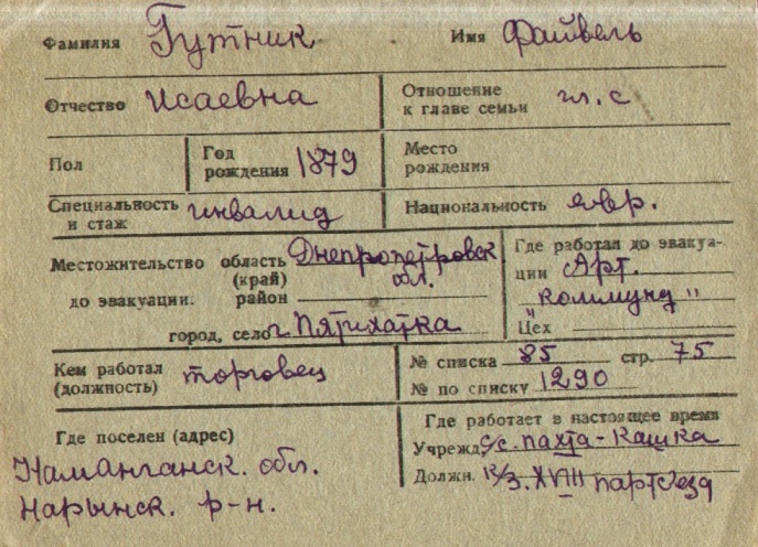 Fayvel Gutnik was born, 1879 to Isay. Prior to WWII she lived in Pyatikhatka, Ukraine (USSR). During the war she was in Uzbekistan (USSR). Fayvel was registered following the evacuation/ in the interior of the Soviet Union.
