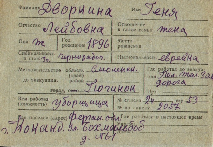 Genya Dvorkina was born, 1896 to Leyb. Prior to WWII she lived in Pochinok, Russia (USSR). During the war she was in Uzbekistan (USSR). Genya was registered following the evacuation/ in the interior of the Soviet Union.