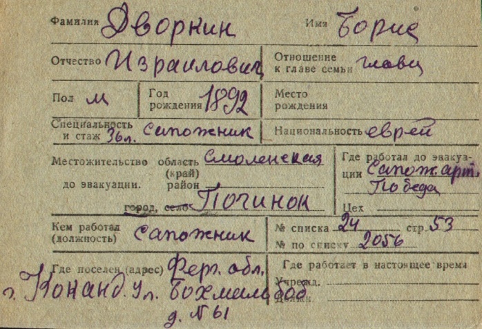 Boris Dvorkin was born, 1892 to Izrail. Prior to WWII he lived in Pochinok, Russia (USSR). During the war he was in Uzbekistan (USSR). Boris was registered following the evacuation/ in the interior of the Soviet Union.