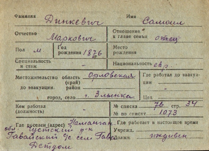 Samoil Dinkevich was born, 1876 to Mark. Prior to WWII he lived in Zlynka, Russia (USSR). During the war he was in Uzbekistan (USSR). Samoil was registered following the evacuation/ in the interior of the Soviet Union.