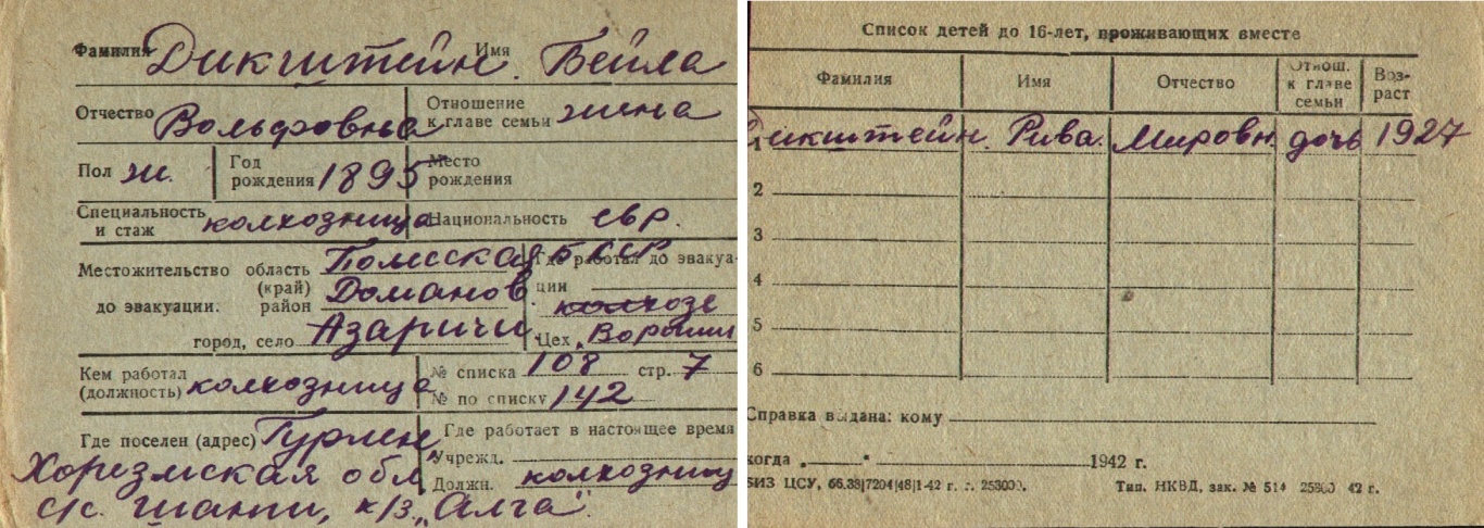 Beyla Dikshteyn was born, 1895 to Volf. Prior to WWII she lived in Azarichi, Belorussia (USSR). During the war she was in Uzbekistan (USSR). Beyla was registered following the evacuation/ in the interior of the Soviet Union.