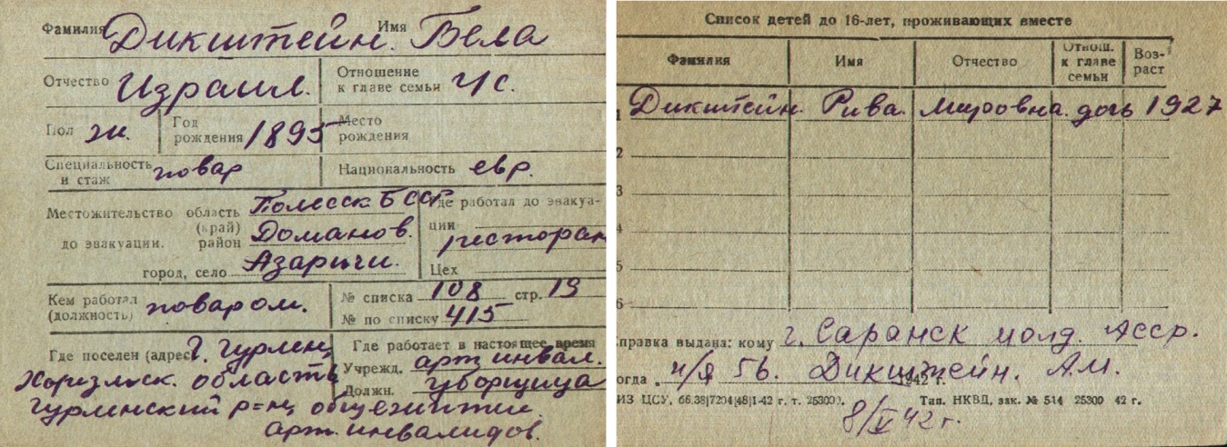 Bela Dikshteyn was born, 1895 to Izrail. Prior to WWII she lived in Azarichi, Belorussia (USSR). During the war she was in Uzbekistan (USSR). Bela was registered following the evacuation/ in the interior of the Soviet Union.