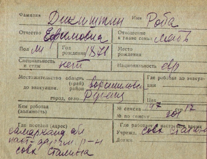 Roba Dikishtin was born, 1876 to Yefim. Prior to WWII she lived in Rubezhnoye, Ukraine (USSR). During the war she was in Uzbekistan (USSR). Roba was registered following the evacuation/ in the interior of the Soviet Union.