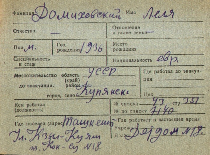 Lelya Domikhovskiy was born, 1936. He was child. Prior to WWII he lived in Kupyansk, Ukraine (USSR). During the war he was in Uzbekistan (USSR). Lelya was registered following the evacuation/ in the interior of the Soviet Union.