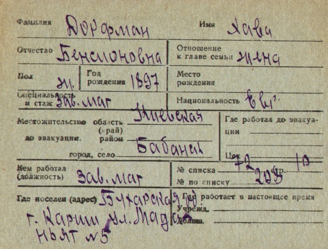 Khava Dorfman was born, 1897 to Bension. Prior to WWII she lived in Babanka, Ukraine (USSR). During the war she was in Uzbekistan (USSR). Khava was registered following the evacuation/ in the interior of the Soviet Union.