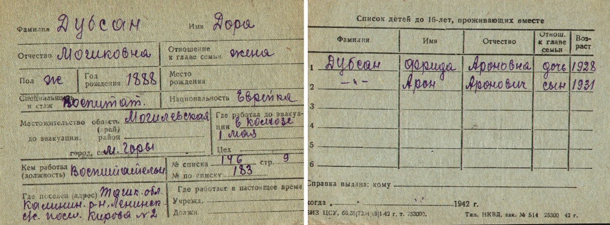 Dora Dubsan was born, 1888 to Moshko. Prior to WWII she lived in Gory, Belorussia (USSR). During the war she was in Uzbekistan (USSR). Dora was registered following the evacuation/ in the interior of the Soviet Union.
