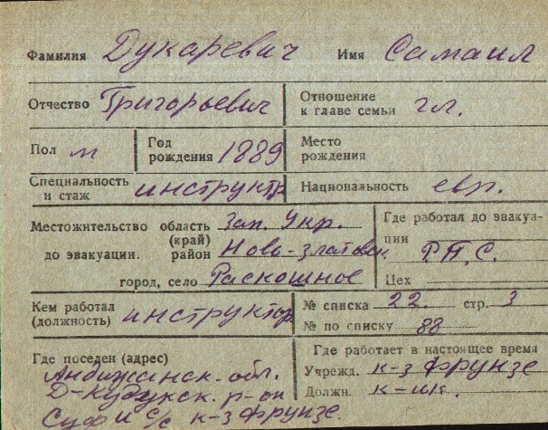 Samail Dukarevich was born, 1889 to Grigoriy. Prior to WWII he lived in Roskoshnoye, Ukraine (USSR). During the war he was in Uzbekistan (USSR). Samail was registered following the evacuation/ in the interior of the Soviet Union.