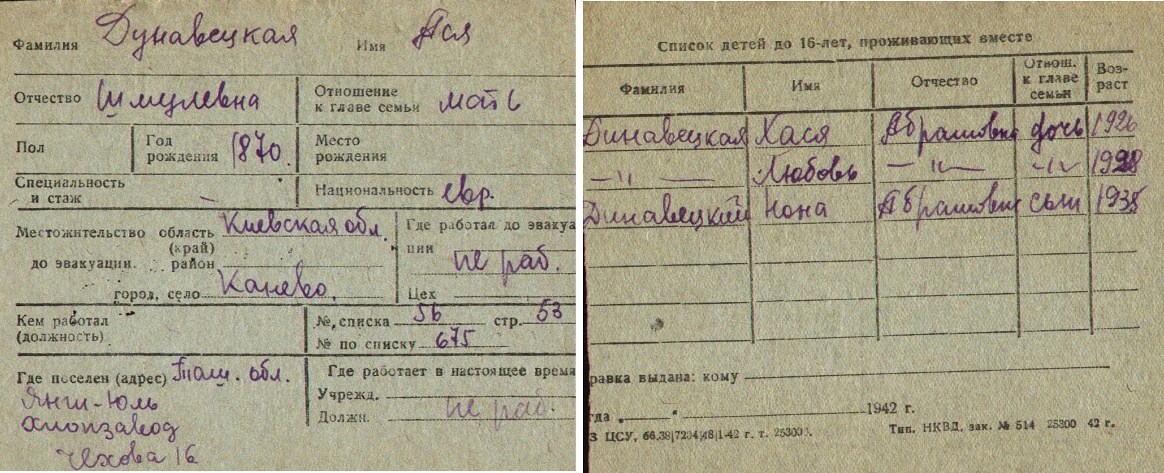 Asya Dunavetzkaya was born, 1870 to Shmul. Prior to WWII she lived in Kanev, Ukraine (USSR). During the war she was in Uzbekistan (USSR). Asya was registered following the evacuation/ in the interior of the Soviet Union.