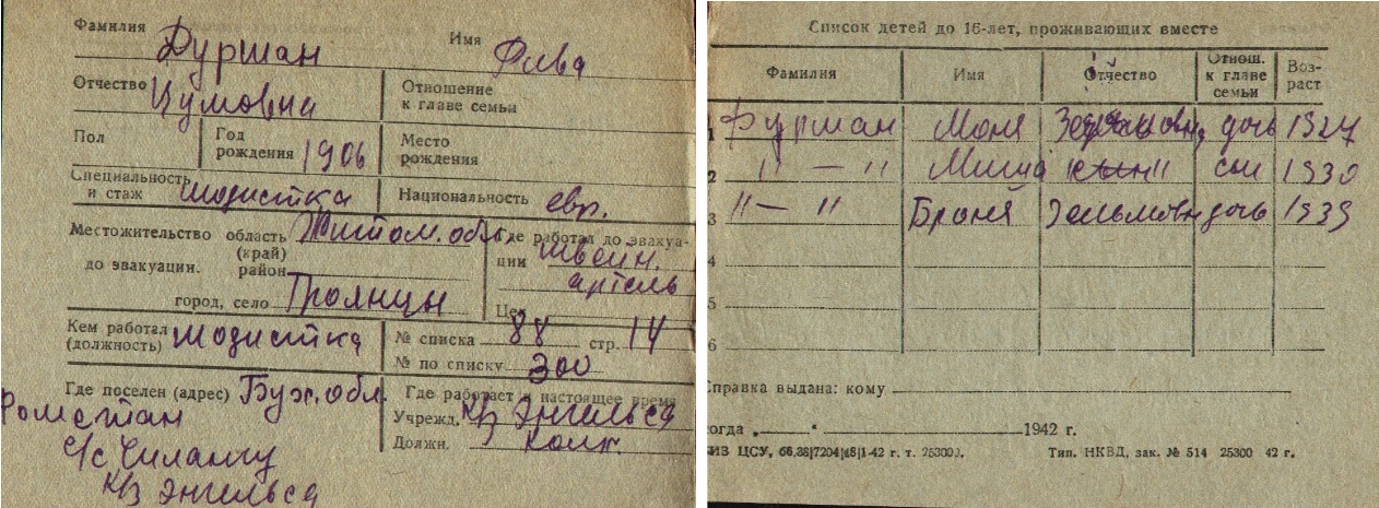 Riva Durshan was born, 1906 to Tzum. Prior to WWII she lived in Troyanov, Ukraine (USSR). During the war she was in Uzbekistan (USSR). Riva was registered following the evacuation/ in the interior of the Soviet Union.