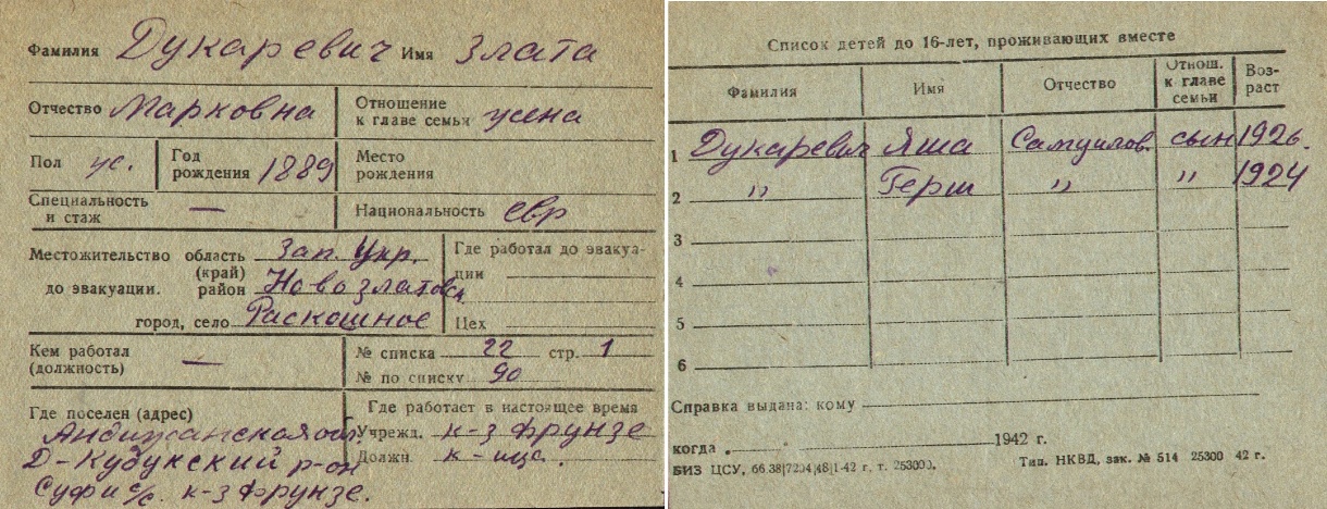 Zlata Dukarevich was born, 1889 to Mark. Prior to WWII she lived in Roskoshnoye, Ukraine (USSR). During the war she was in Uzbekistan (USSR). Zlata was registered following the evacuation/ in the interior of the Soviet Union.